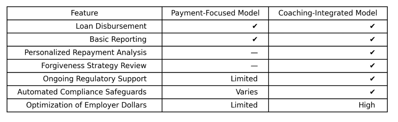 This model combines employer contributions with individualized borrower support and automated compliance oversight.